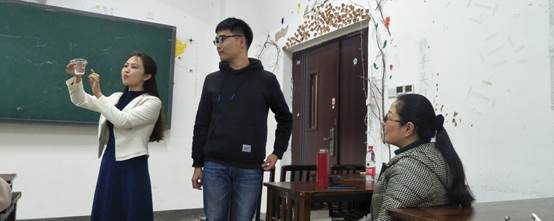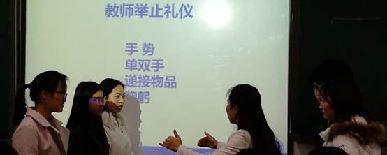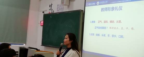 张敏敏老师从表情、仪容、举止、站姿、坐姿、蹲姿、递送东西等方面来进行教师礼仪的讲解。张老师首先介绍教师表情要正气、温和、镇定、从容,男女教师的表情是不一样的,男老师只需要眉头舒展开就行,而女老师在眉头舒展开的同时,还需要嘴角轻微上扬。在站姿、坐姿、蹲姿等方面,张老师首先让同学们进行演示,演示后张老师及时给予评价,若同学演示的不正确,张老师会为员工讲解具体应当怎么做,为什么这样做。现场学习氛围浓厚,师生认真听讲。