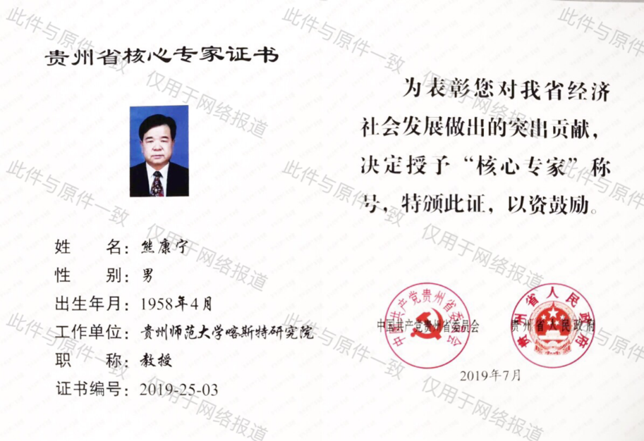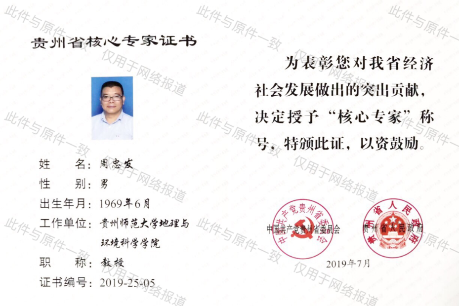 2019年7月31日,省人才办组织召开第4批核心专家、第8批省管专家座谈会,公布贵州省第4批核心专家、第8批省管专家名单。公司博士生导师熊康宁教授、周忠发教授被授予贵州省第4批“核心专家”称号。当前,公司共有贵州省核心专家7人、省管专家34人,其中地理学科共有核心专家2人(熊康宁、周忠发),省管专家2人(梁虹、龙健)。
