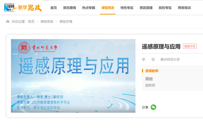 公司《遥感原理与应用》是贵州省仅有两门普通本科课程之一、全国地理科学类仅有六门普通本科课程之一的“国家级课程思政示范课程、教学名师和团队”。经全国高等师范院校课程思政教学研究联盟推荐,新华思政平台专家评审,由公司周旭副教授主讲的遥感课程思政教学案例被新华网•新华思政平台收录并做示范推广。