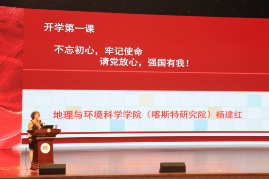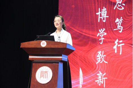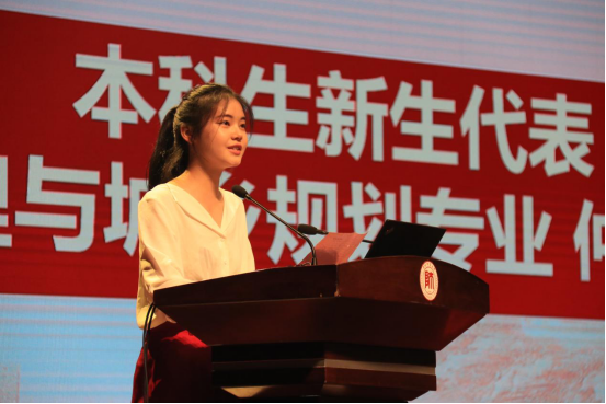2021级本科新生代表人文地理与城乡规划专业仲高灿同学在发言中表达了对老员工活的期待、喜悦之情,她代表新生表态,他们将脚踏实地,志存高远,不忘初心,只争朝夕,做担当民族复兴大任的新时代青年,不断奋勇前行。