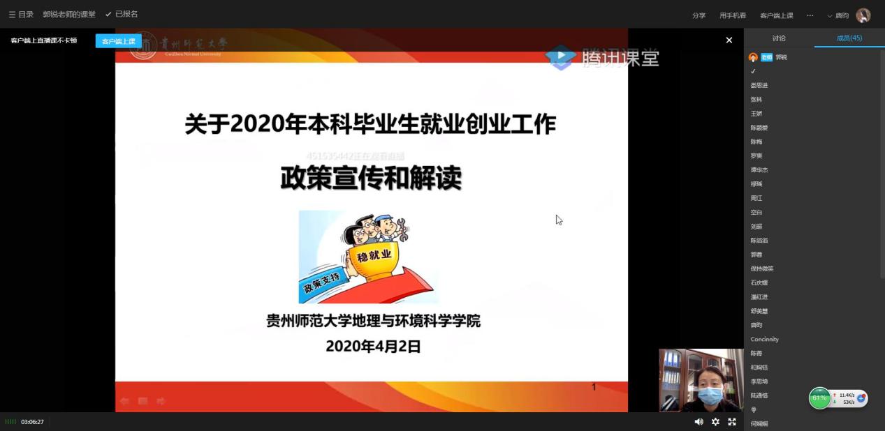本次就业指导课分专业分班级进行。首先,郭锐亲切问候毕业班的同学,并就当前疫情期间公司的工作安排给大家做简要说明,强调了毕业班当前的两大任务是毕业论文和就业。其次,郭锐就今年就业面临压力和带来的机遇给同学们做详细解释。郭锐先是深入分析了今年的就业形势的严峻性,提醒同学们要提高就业紧迫感,积极投身求职应聘;接着就基层项目就业政策做了详细解读,鼓励同学们积极投身基层,让青春在脱贫攻坚主战场和基层一线上闪闪发光。最后,郭锐再次强调公司暂未确定返校时间,望同学们积极配合公司的疫情防疫工作。